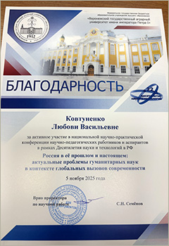 5 ноября 2025 г. заведующий кафедрой педагогики и педагогической психологии, доктор педагогических наук, профессор Любовь Ковтуненко, выступила с пленарным докладом «Образование в потоке перемен: методологические перспективы» в Воронежском государственном аграрном университете имени императора Петра I на II Национальной научно-практической конференции научно-педагогических работников и аспирантов на тему «Россия в её прошлом и настоящем: актуальные проблемы гуманитарных наук в контексте глобальных вызовов современности».