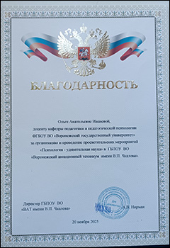 Всем студентам и доценту Ивановой О.А. были вручены Благодарности от директора ГБПОУ ВО «Воронежский авиационный техникум им. В.П. Чкалова».