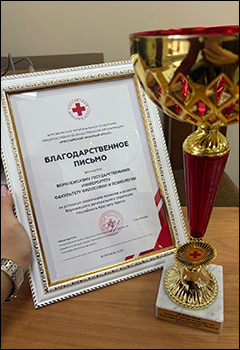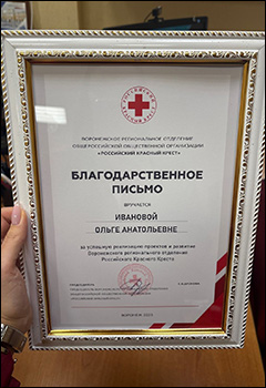 Председатель Воронежского регионального отделения общероссийской общественной организации «Российский Красный Крест» Е.В. Дронова вручила благодарственные письма за успешную реализацию проектов и развитие отделения факультету философии и психологии ВГУ, а также лично Ивановой Ольге Анатольевне и Мазкиной Ольге Борисовне.